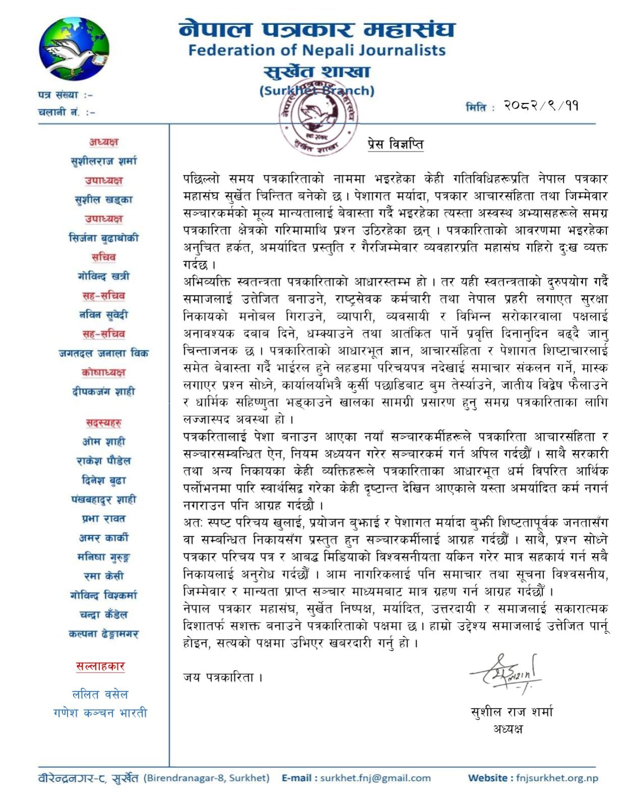नेपाल पत्रकार महासंघ सुर्खेत शाखाले पत्रकार आचारसंहिता र सञ्चारसम्बन्धी ऐन–नियमको अध्ययन र पालना गर्दै स्पष्ट परिचय खुलाइ, मर्यादाभित्र रहेर मात्र सञ्चारकर्म गर्न सबै सञ्चारकर्मीलाई आग्रह गरेको छ ।