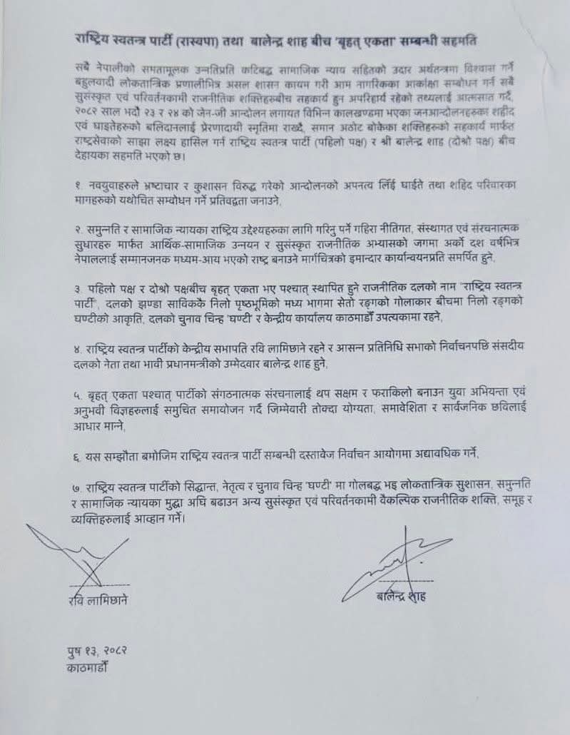 काठमाडौं पुस १३ गते । राष्ट्रिय स्वतन्त्र पार्टी (रास्वपा) र काठमाडौं महानगरपालिकाका मेयर बालेन्द्र शाह (बालेन) बिच ७ बुँदे सहमति भएको छ । उनिहरूबिच आइतबार बिहान (पुस १३ गते) सहमति भएको हो । आइतबार बिहान भएको सहमतिपत्रमा रवि लामिछाने र बालेन्द्र शाहले हस्ताक्षर गरेका छन् ।एकीकरणपछि पार्टीको नाम राष्ट्रिय स्वतन्त्र पार्टी र चुनाव चिह्न घण्टी नै रहने भएको छ । दुई नेताबीच राष्ट्रिय स्वतन्त्र पार्टीको केन्द्रीय सभापति रवि लामिछाने रहने र आसन्न प्रतिनिधिसभाको निर्वाचनपछि संसदीय दलको नेता बालेन्द्र शाह हुने सहमति भएको छ ।