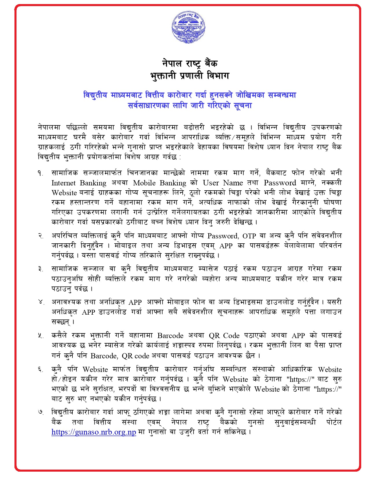विभिन्न विद्युतीय उपकरणको माध्यामबाट घरमै बसेर कारोबार गर्दा विभिन्न आपराधिक व्यक्ति/समूहले विभिन्न माध्यम प्रयोग गरी ग्राहकलाई ठगी गरिरहेको गुनासो आइरहेकाले विशेष ध्यान दिन राष्ट्र बैंकले आग्रह गरेको छ।