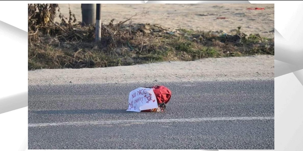 नो एमसीसी लेखिएको शंकास्पद वस्तु बम नभएको प्रहरीले जनाएको छ । उक्त वस्तु राखेको आरोपमा एक जना व्यक्ति पनि पक्राउ परेको प्रहरीले जनाएको छ ।