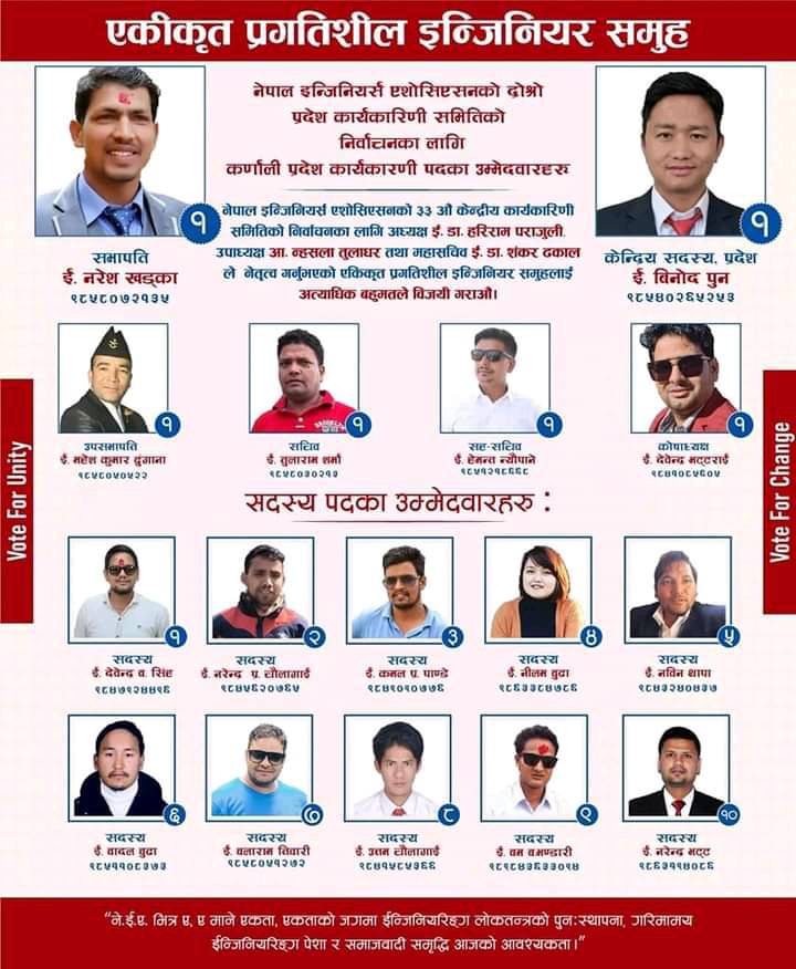 सुर्खेत – ईन्जिनियरिङ एसोसिएसन कर्णाली प्रदेशको दोस्रो कार्यकारिणी समितिको फागुन २७ गते हुने चुनावमा एकीकृत प्रगतिशील ईन्जिनियर समूहबाट सभापतिमा ईन्जिनियर नरेश खड्काले आफ्नो उम्मेदवारी दिएका छन् ।
